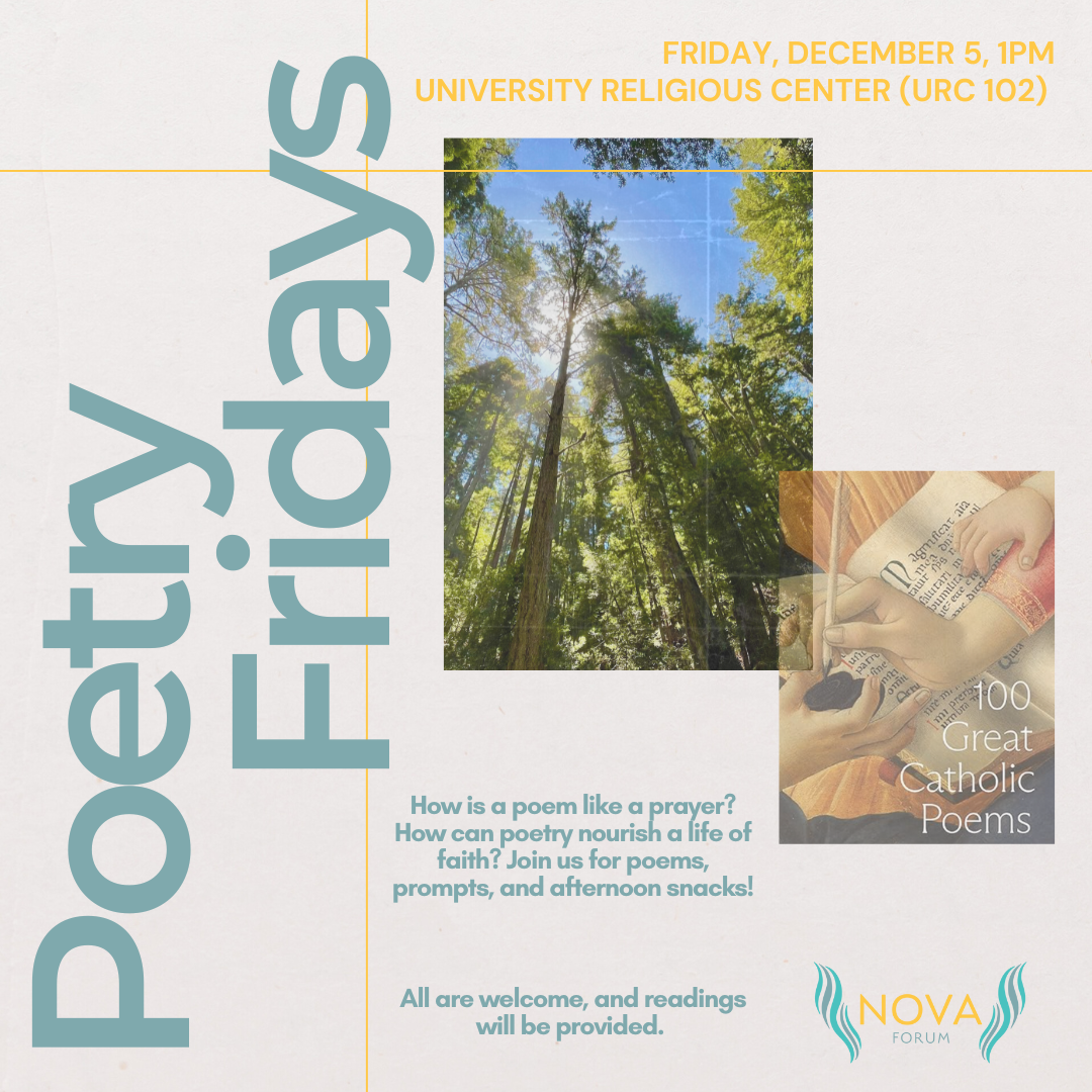 We will read and discuss poems from the anthology 100 Great Catholic Poems, followed by guided creative writing prompts. All are welcome, and readings will be provided. Make sure to bring a pen and notebook!